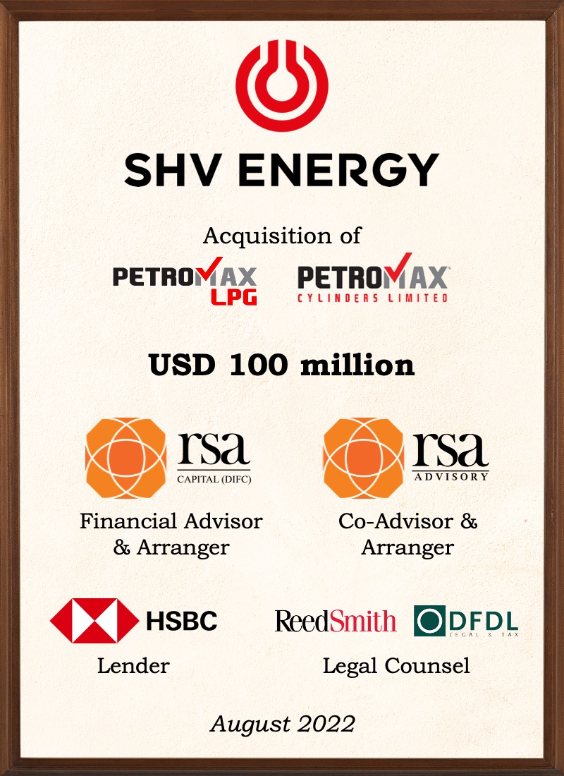 Completed SHV Energy’s 100 million USD acquisition of Petromax LPG and Petromax Cylinders Ltd. as the Co-Advisor & Arranger.