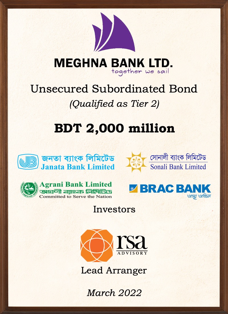 Arranged an Unsecured Subordinated Bond (Tier-2) worth BDT 2,000 million for Meghna Bank PLC in March 2022.